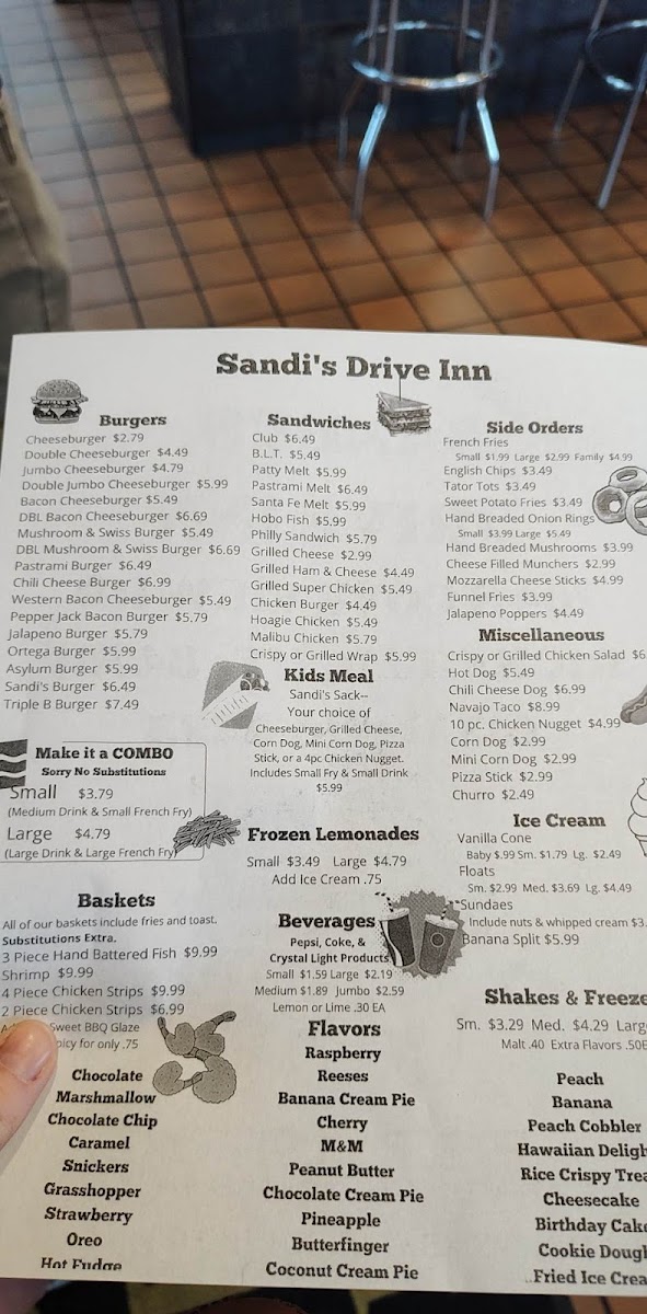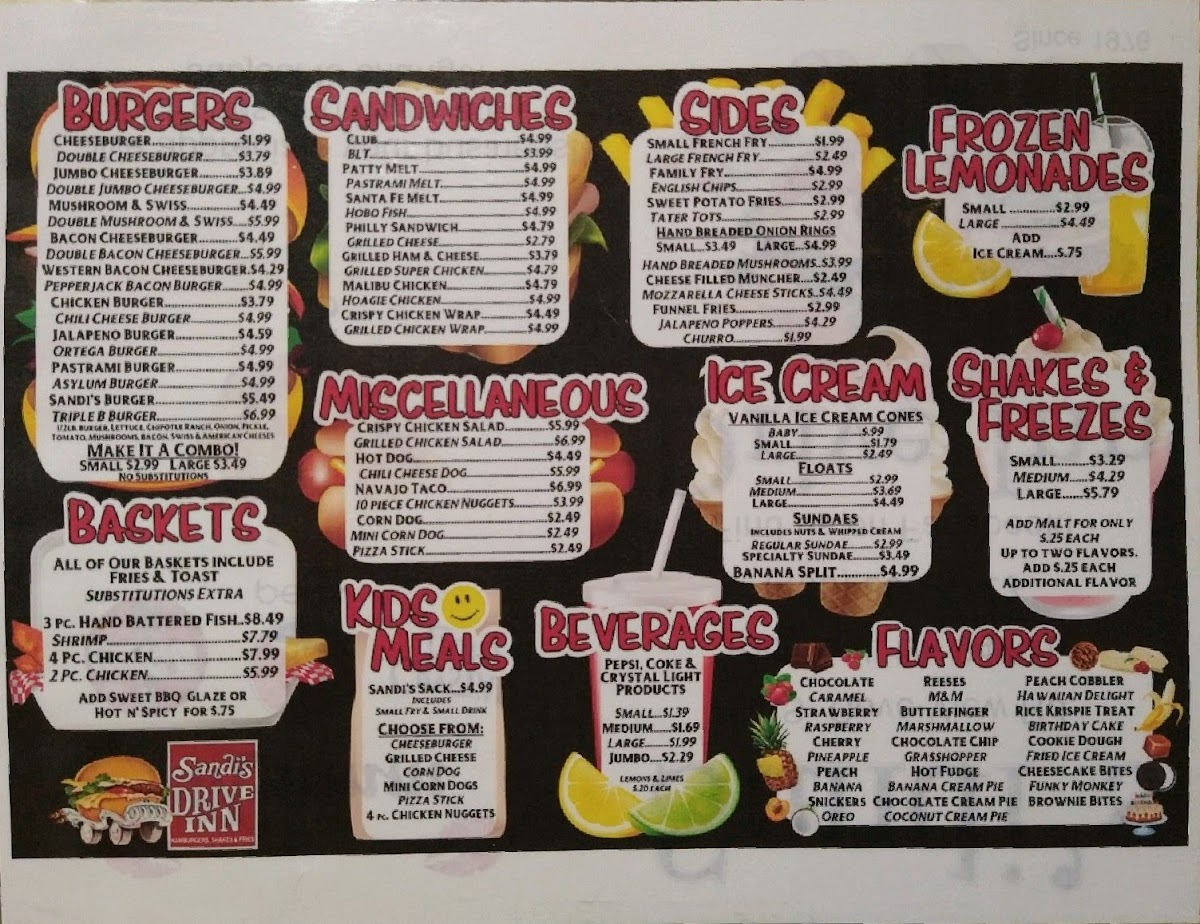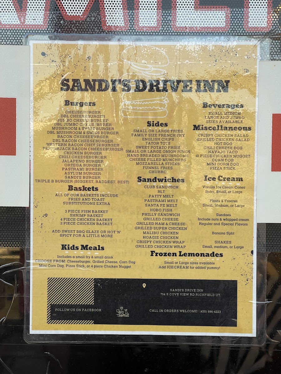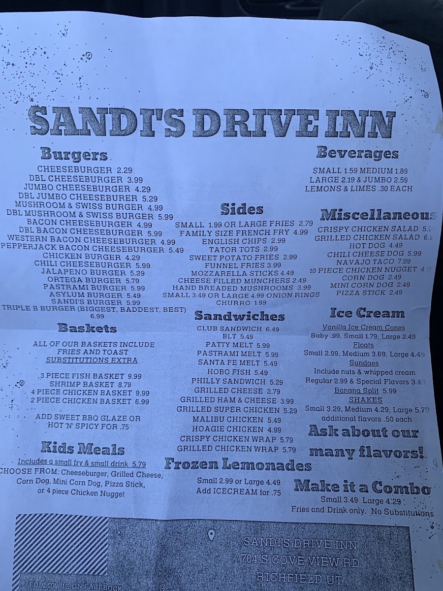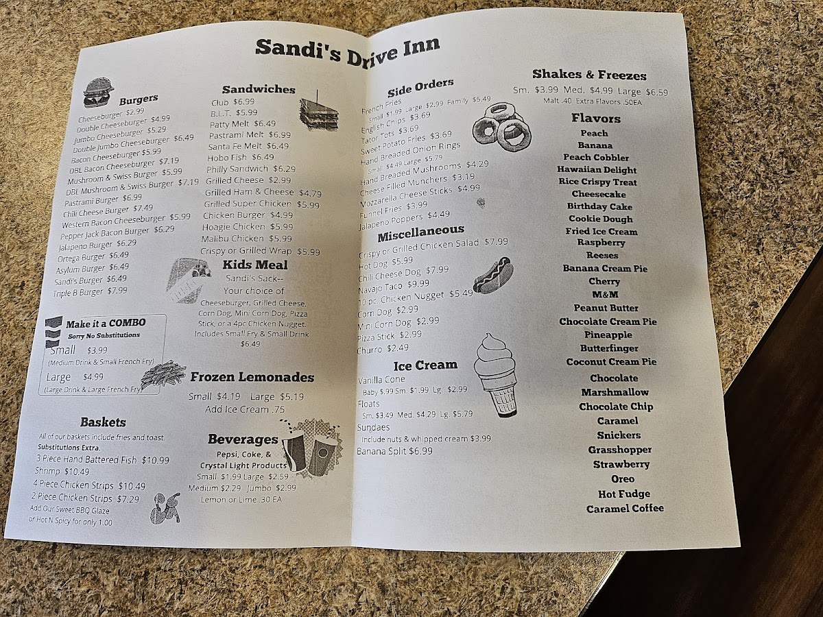 Welcome to Sandi's Drive Inn, a cherished gem located at 704 Cove View Rd in Richfield, UT. The menu here presents a delightful mix of classic fast food favorites alongside hearty sit-down options, making it ideal for every craving.